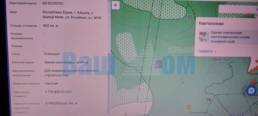 Продается земельный участок площадью 8 соток в Крыму, г. Алушта, Малый Маяк, ул. Ручейная 26. Вид разрешенного использования ИЖС. КАД. № 90:15:050101:307. Участок видовой, правильной формы, рельеф ровный. Подъездная дорога асфальт и две грунтовки. Панорамный вид на море и горы Демерджи, Кастель, Бабуган. Снизу виноградники.